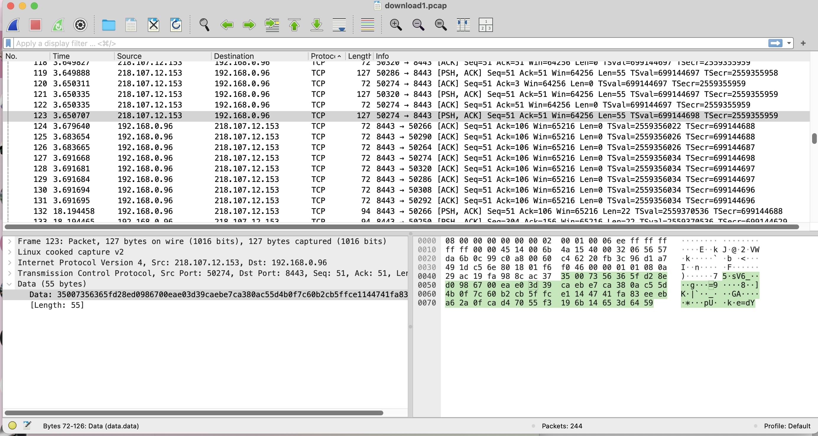 Wireshark 打开noise.pcap包,找一个 带有[PSH, ACK]标志的包(表示有实际数据),查看 “Packet Details” 面板最后一行之后的内容 —— 如果有 “Data” 或 “Unreassembled Fragment”,就点开它。